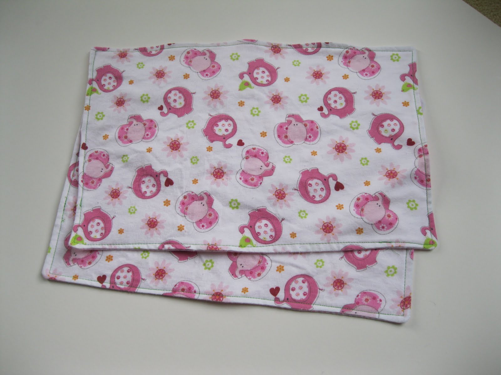 I took the scraps I had left from the "just in case it's a girl" blanket I made and sewed two girl-theme burp cloths. I just love pink elephants.